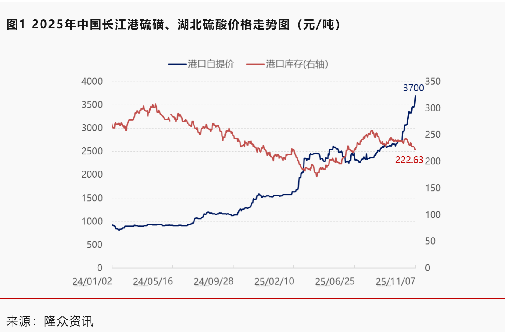 支撑这波涨势的原因:国际端:俄罗斯从净出口国转为进口国,加拿大天然气管道维护、中东原油减产进一步收紧供应,中东生产商上调四季度官价强化成本支撑。国内端:港口库存持续走低,截至11月7日,硫磺港口总库存222.63万吨,环比降6.12万吨,降幅约2.68%;同比低12.55万吨,降幅约5.34%。下游企业为储备原料刚需采购跟进,加之到船量少,贸易商看涨情绪升温积极建仓,供需失衡下价格持续攀升。叠加俄乌冲突背景下,乌克兰对俄罗斯炼油设施的攻击持续影响供应稳定性,市场普遍预期硫磺短期涨势难止。