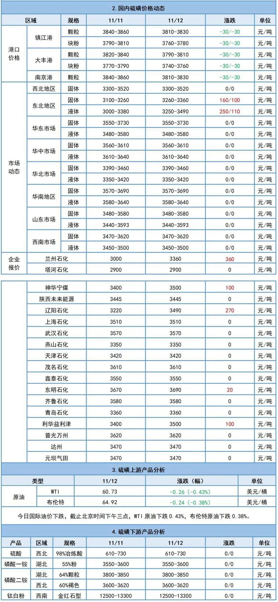 11月12日硫磺日评:国产硫磺价格稳中有涨,港口硫磺价格高位回调