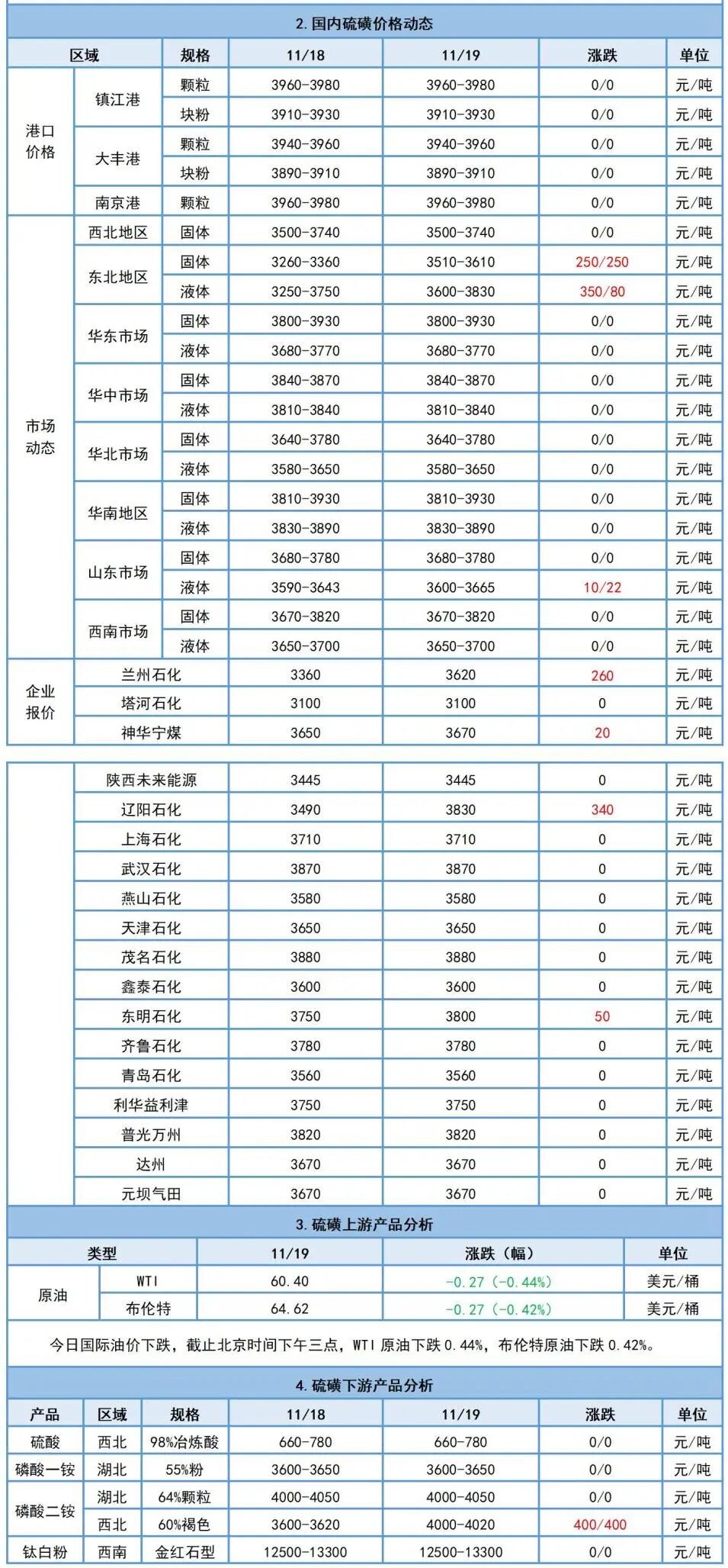 11月19日硫磺日评:国产硫磺价格稳中有涨,港口硫磺价格高位盘整