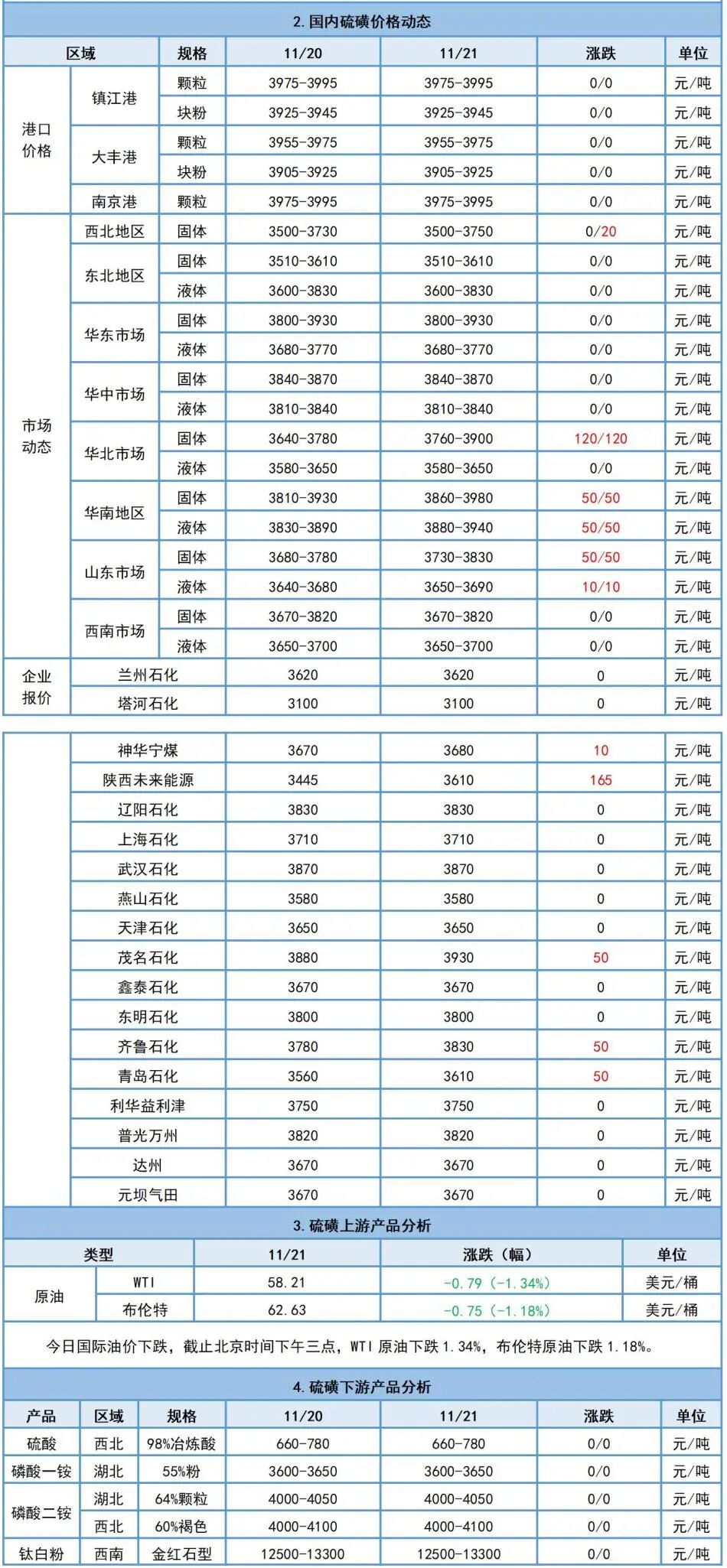 11月21日硫磺日评:国产硫磺价格稳中上行,港口硫磺价格高位盘整