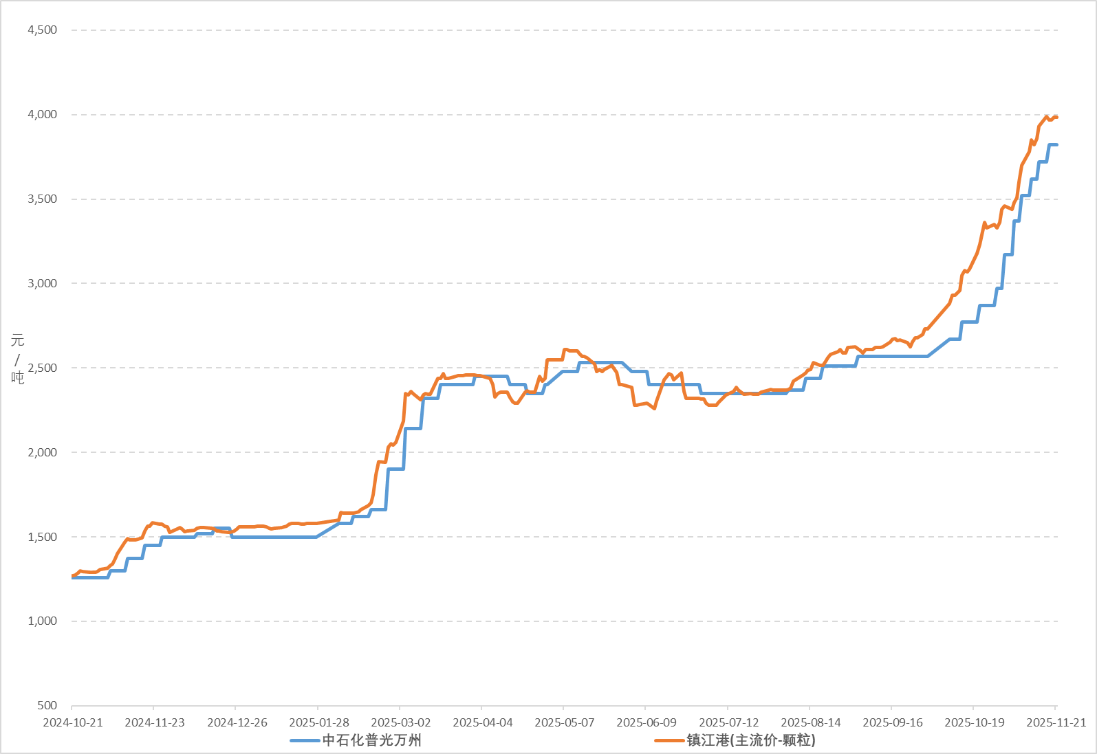 本周期港口硫磺市场价格震荡上行;截至11月21日,镇江港颗粒硫磺价格3985元/吨,较11月14日上涨55元/吨,涨幅1.40%。 本周期国际硫磺市场表现强势,为国内现货市场提供强劲支撑,加之国内大型炼厂硫磺销售招标连续上涨,各地主营炼厂报价同步跟涨,进一步强化市场信心,持货商普遍捂盘惜售,低价货源依旧难寻,港口硫磺市场价格继续上涨,不过现货交投氛围趋于理性,工贸双方意见分歧互动消息有限,抑制涨幅。