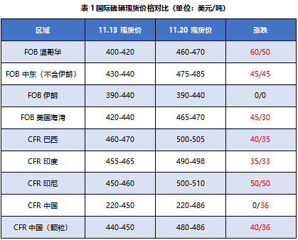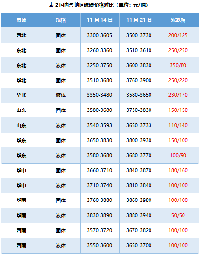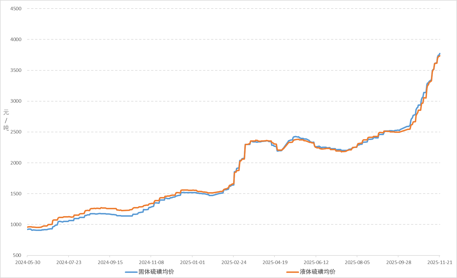 本周期国产硫磺市场均价持续走高。截至11月21日,固体硫磺均价3771元/吨,较11月14日上涨162元/吨,涨幅4.48%;液体硫磺均价3737元/吨,较11月14日上涨126元/吨,涨幅3.50%。