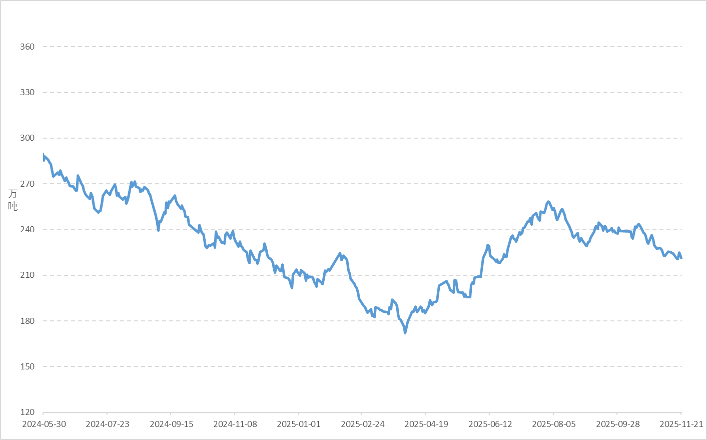 本周期港口硫磺库存呈下降态势;截至11月21日,港口硫磺库存221.23万吨,较11月14日的224.04万吨,减少2.81万吨,降幅1.25%
