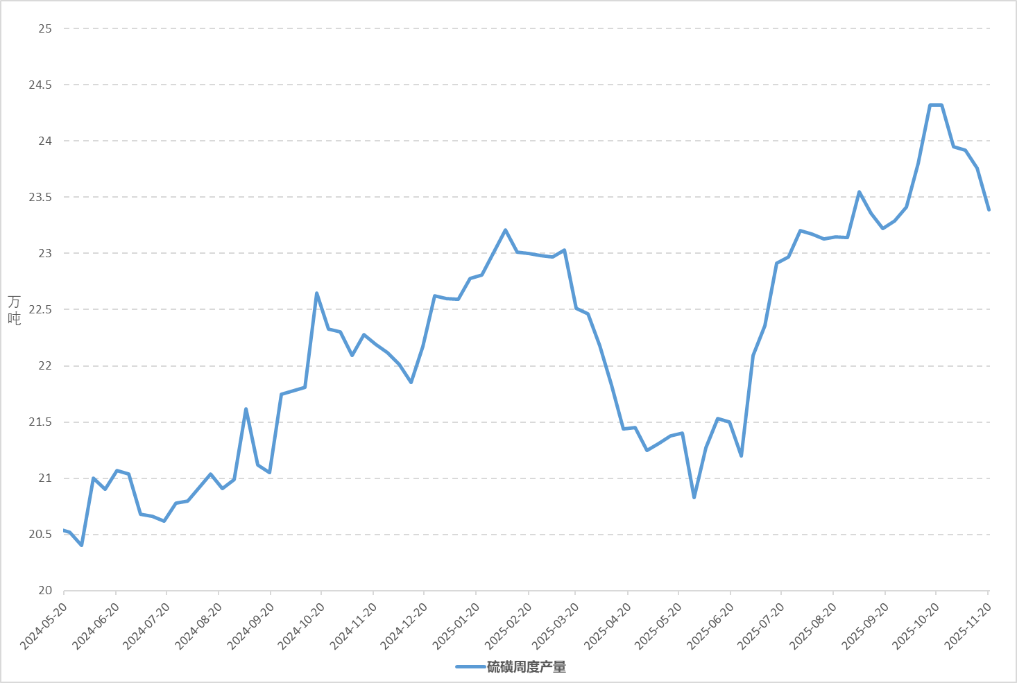 本周期中化泉州炼厂装置停车,山东华星炼厂供应恢复,其他存量装置并无明显变动,全国硫磺市场供应继续减量;截至11月20日,国内硫磺周度产量23.39万吨,环比上周减少0.37万吨。