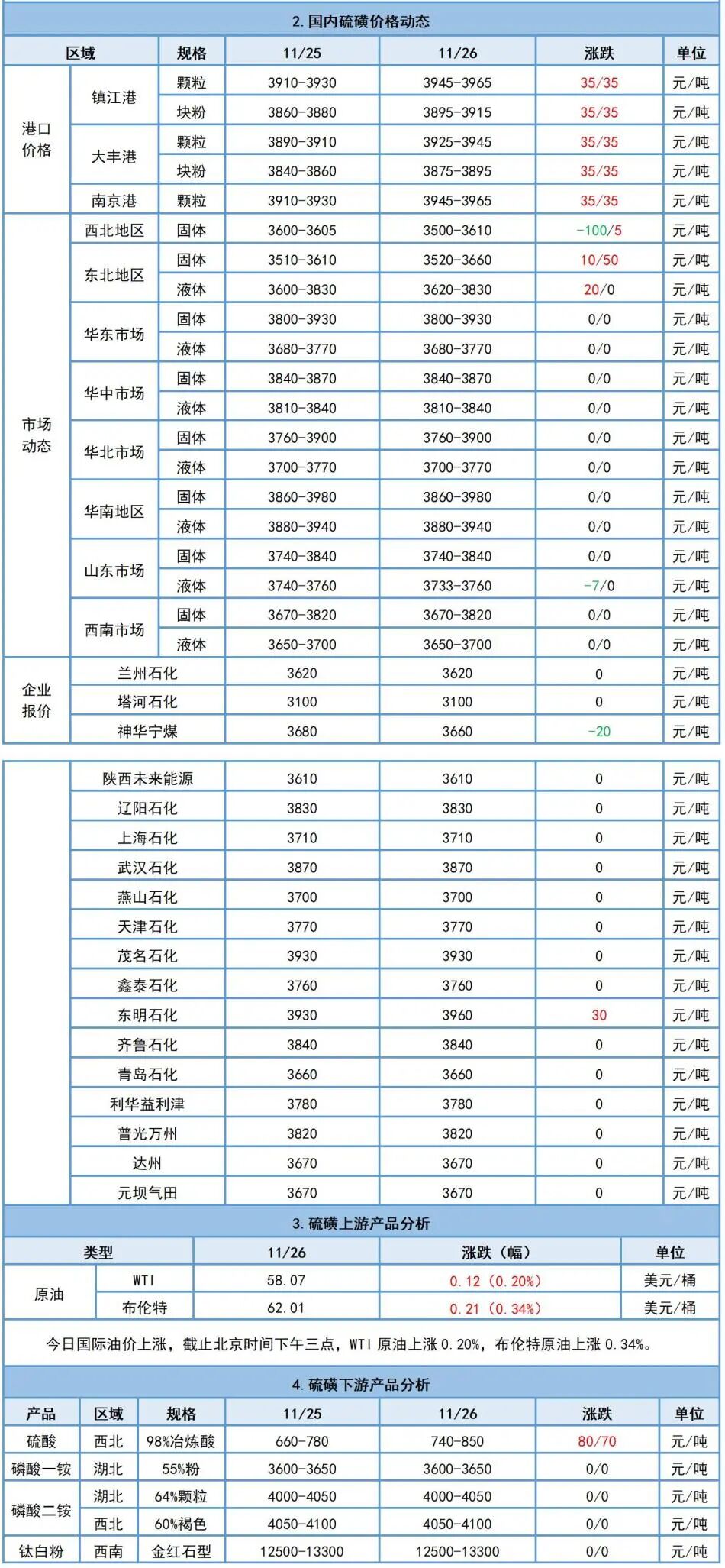 11月26日硫磺日评:国产硫磺价格局部涨跌,港口硫磺价格反弹上涨