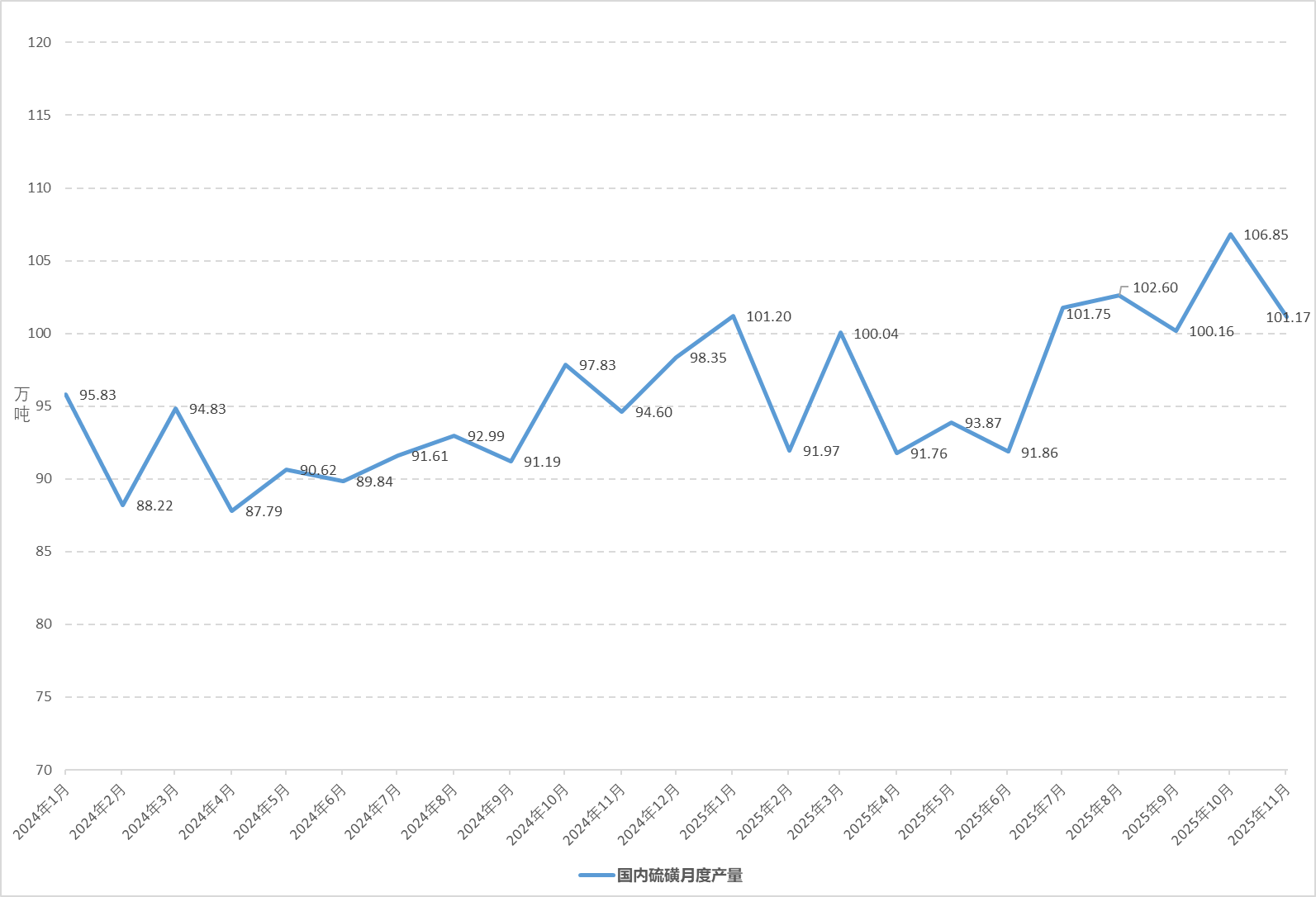 11月,国内硫磺产量101.17万吨,环比减少5.68万吨,降幅5.32%。