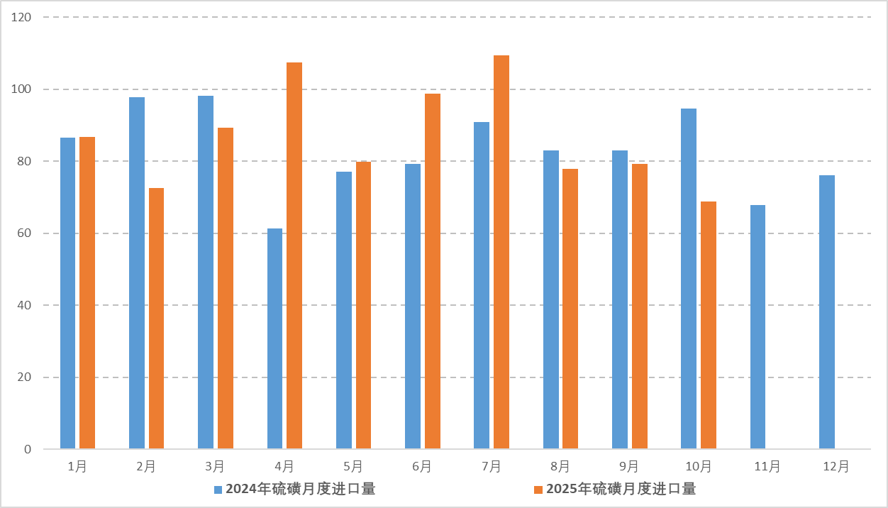 2025年10月,中国硫磺进口68.89万吨,环比下降13.14%,同比下降27.14%。1-10月中国硫磺进口累计869.87万吨,累计同比增加2.16%。