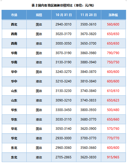 11月,受国际硫磺市场强势以及港口硫磺涨价氛围带动,国产硫磺市场价格全面宽幅上行,幅度500-965元/吨。