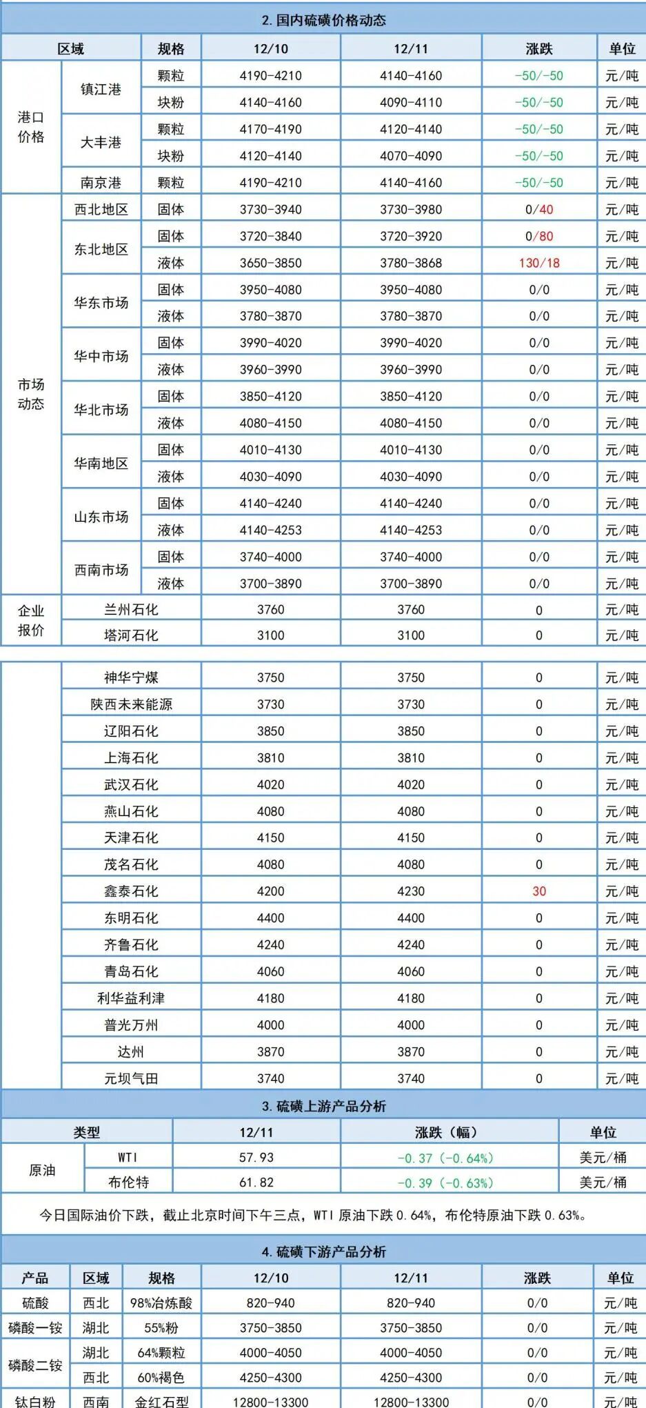 12月11日硫磺日评:国产硫磺价格局部上行,港口硫磺价格高位回调