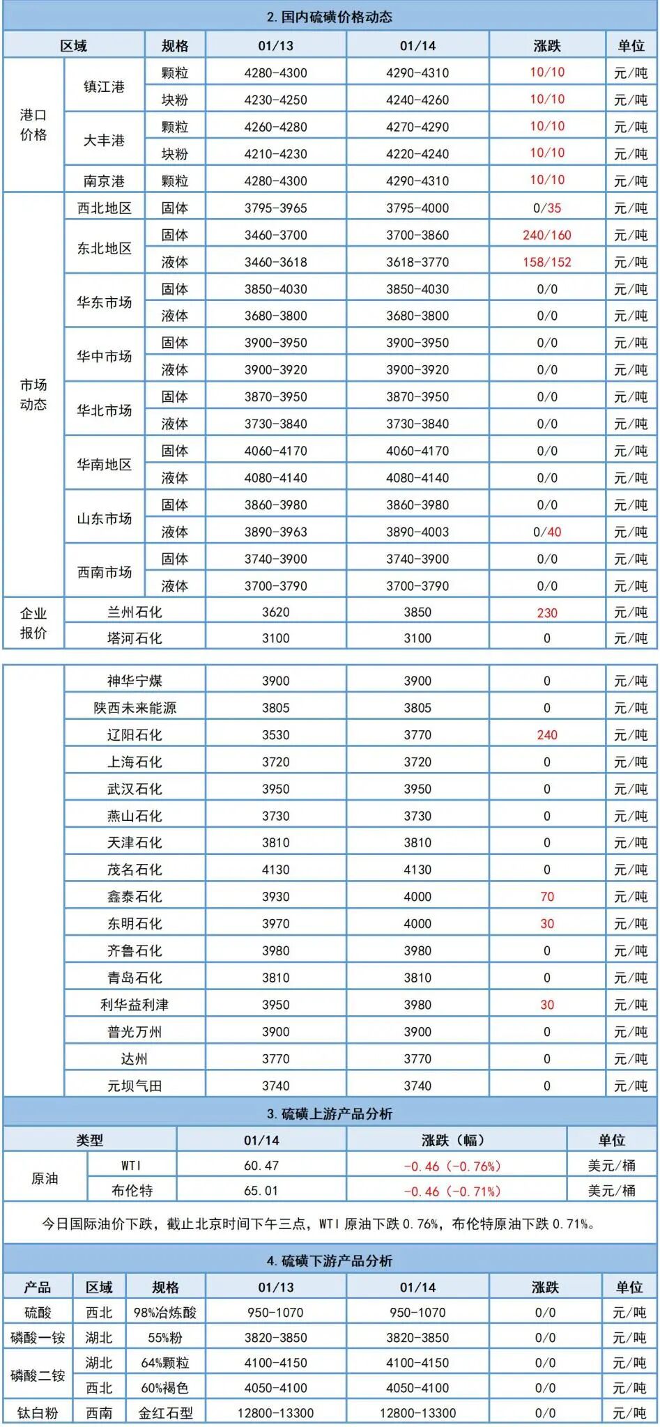1月14日硫磺日评:国产硫磺价格稳中有涨,港口硫磺价格继续冲高