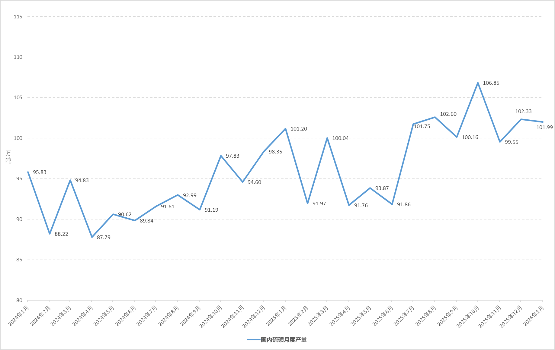 2026年1月,国内硫磺产量101.99万吨,环比减少0.34万吨,降幅0.33%。