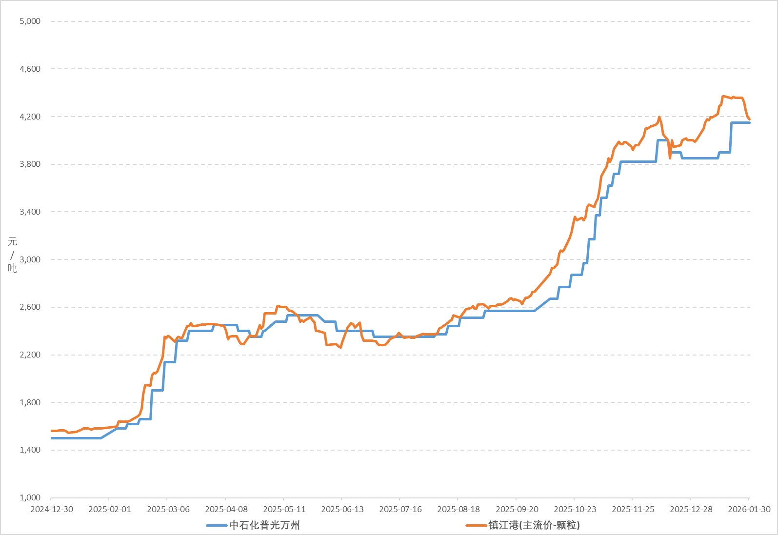 2026年1月,港口硫磺市场价格先扬后抑,整体走高。截至1月30日,镇江港颗粒硫磺价格4180元/吨,环比上涨180元/吨,涨幅4.50%。