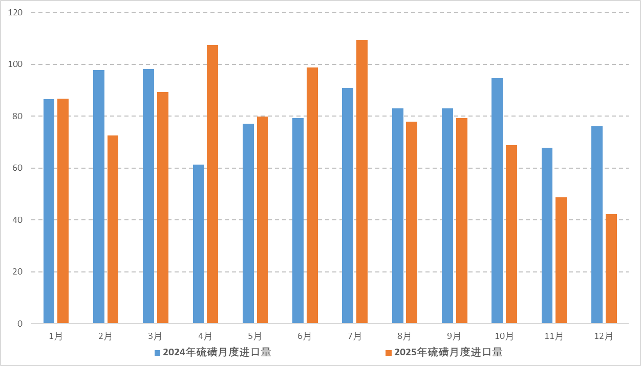 图4 2024-2025年中国硫磺进口月度数据对比趋势图