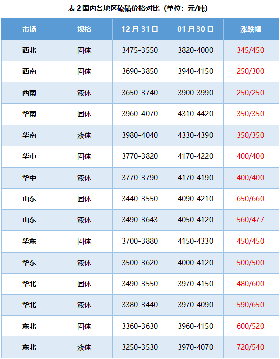 截至1月30日,国内固体硫磺均价4126元/吨,环比上涨459元/吨,涨幅12.51%;国内液体硫磺均价4099元/吨,环比上涨477元/吨,涨幅13.17%。