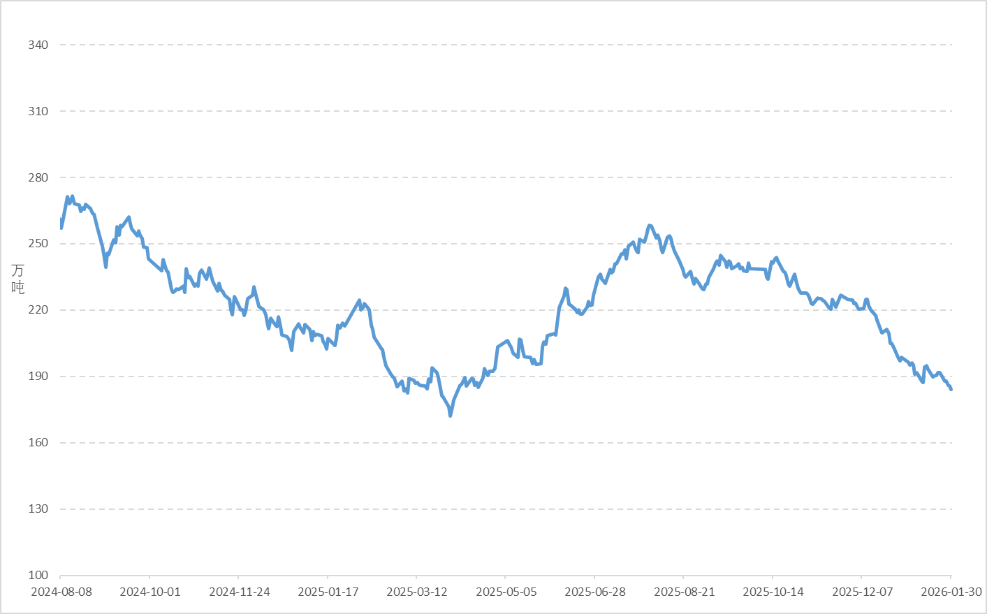 截至1月30日,港口硫磺库存达184.12万吨,较12月31日的198.48万吨,下降14.36万吨,降幅7.23%。