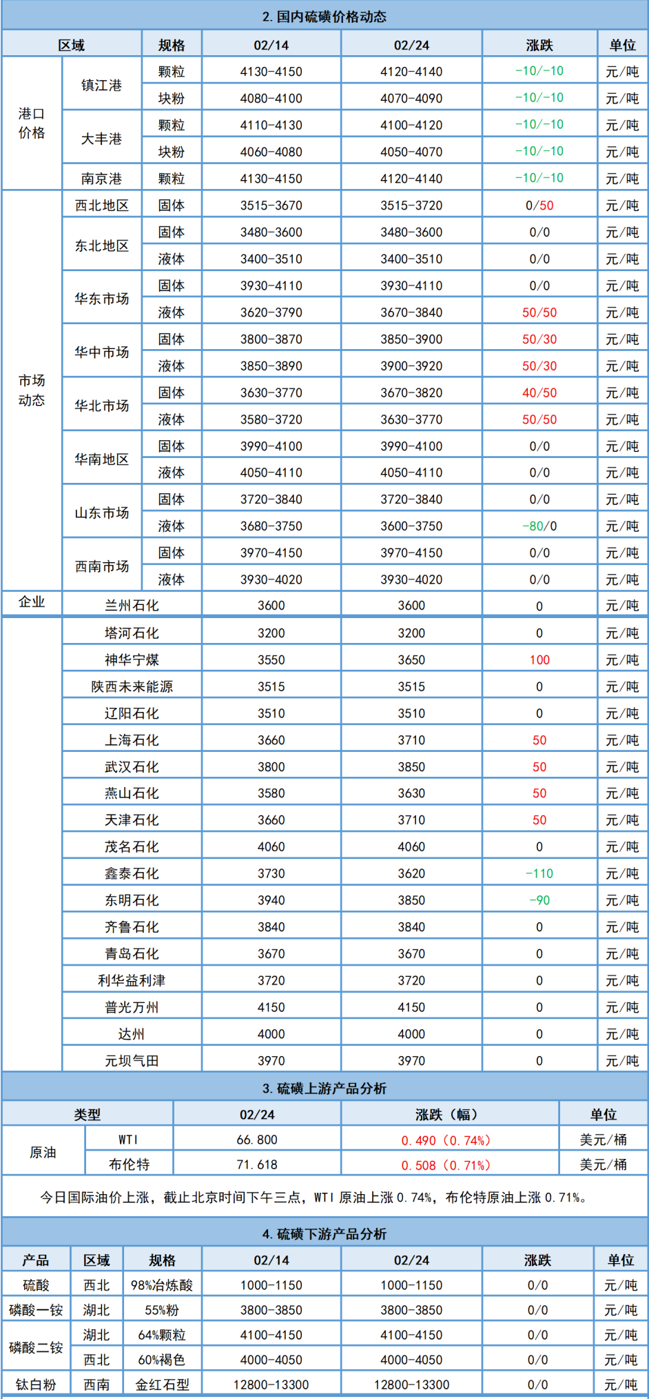 2026年02月24日硫磺日评:国产硫磺价格稳中有涨跌,港口硫磺价格小幅下跌