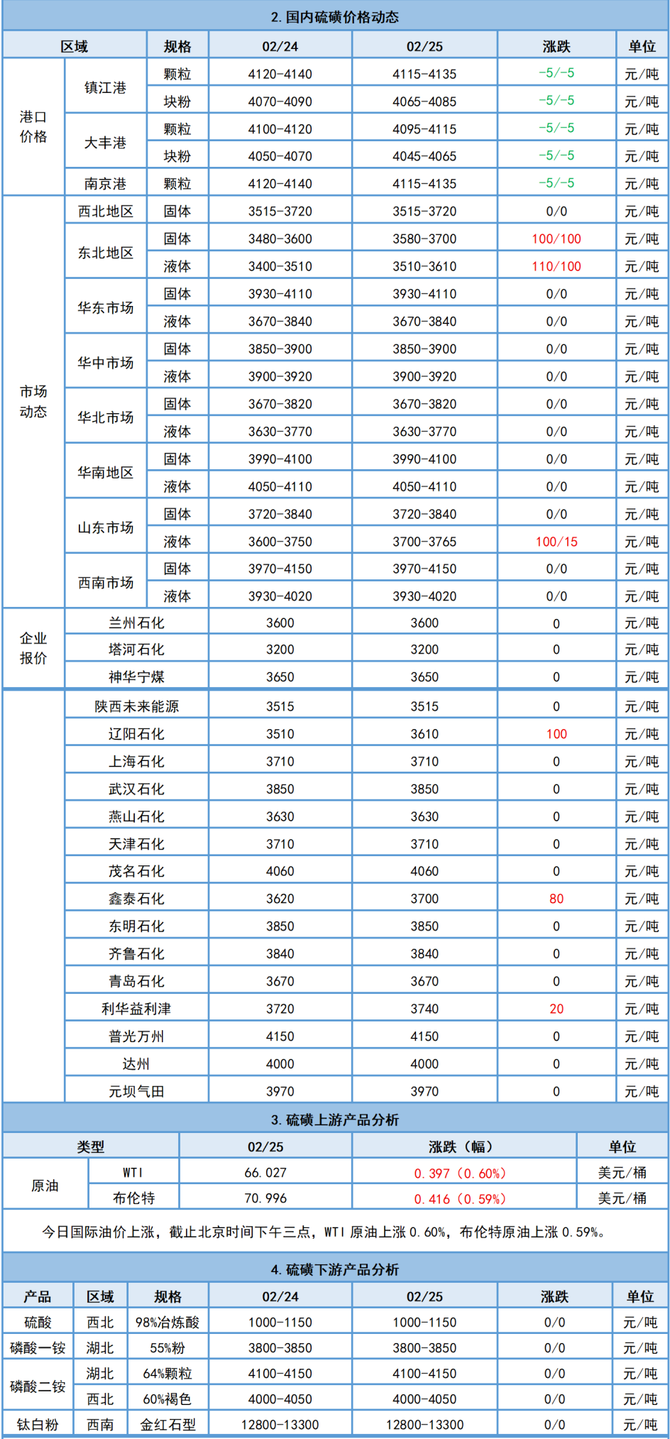 2026年2月25日硫磺日评:国产硫磺价格稳中有涨,港口硫磺价格继续下跌