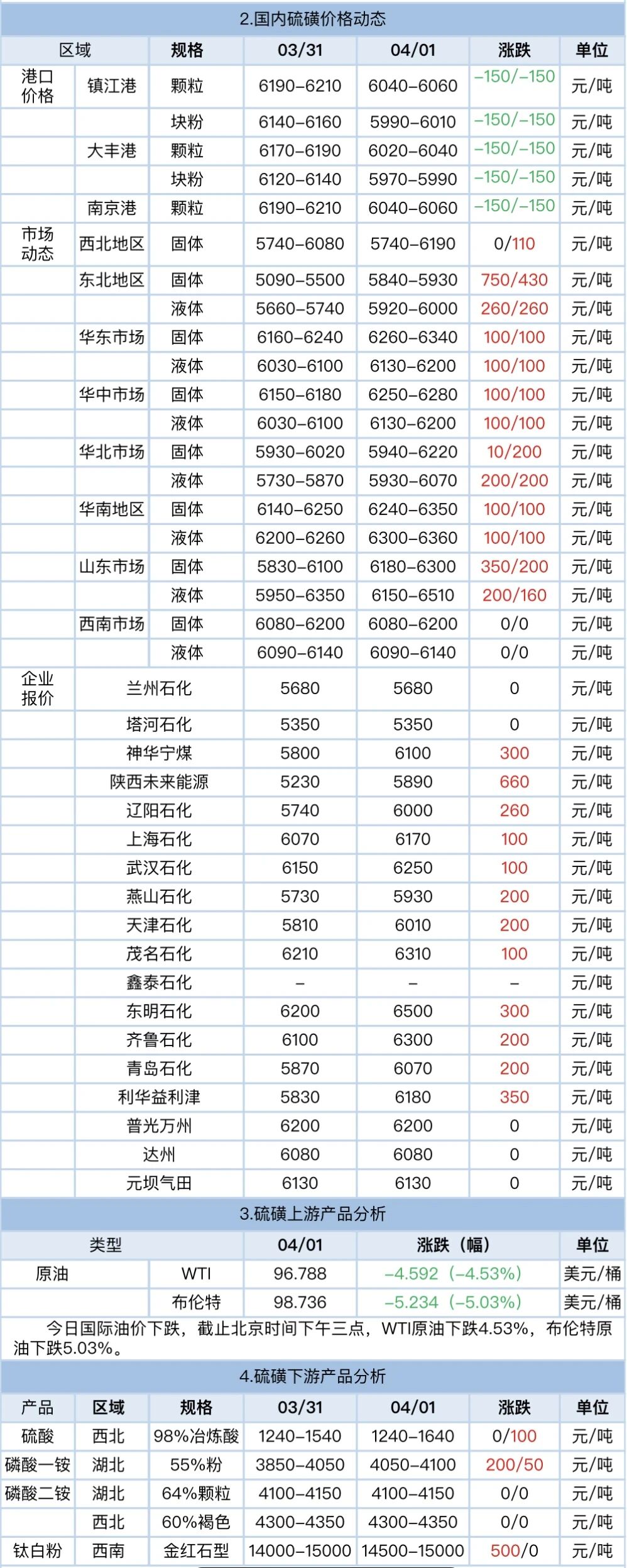 2026年4月1日硫磺日评:国产硫磺价格延续涨势,港口硫磺价格高位回调