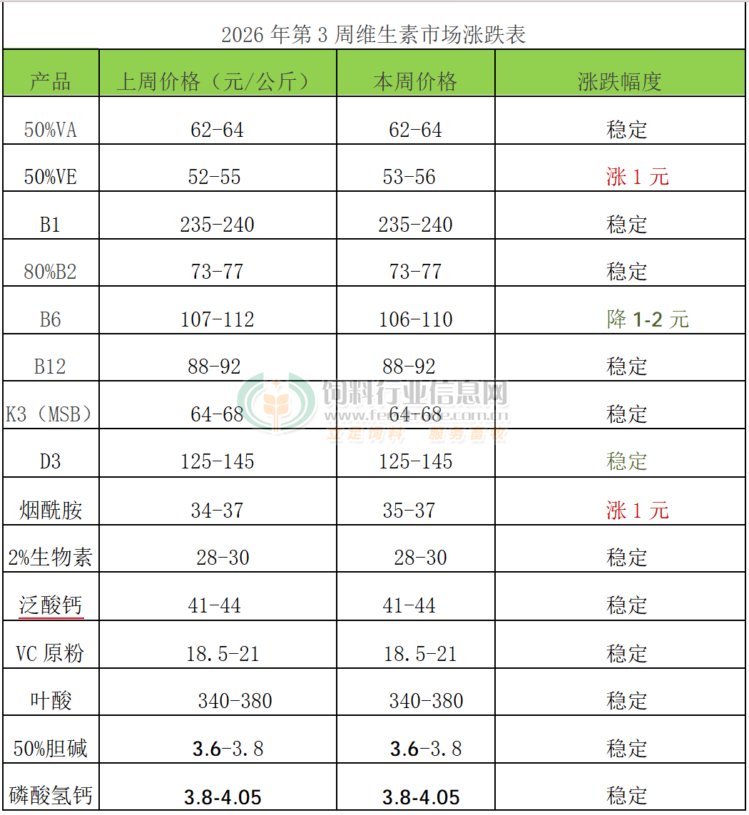 VA:本周VA市场报价62-64元/公斤。欧洲VA1000市场报价15-16欧元/公斤。6月12日巴斯夫VA解除不可抗力影响。10月28日市场称部分厂家报价提至70-72元/公斤。2026年1月6日市场称新和成VA提价至70元/公斤。2026年1月15日市场称浙江医药VA提价至75元/公斤。