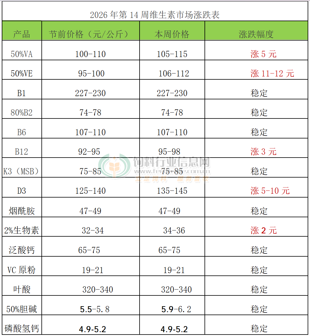B12:本周市场报价95-98元/公斤左右,3月厂家挺价意愿增加,市场购销好转,成交上行。4月1日市场称河北华荣B12产品提价至105元/公斤。