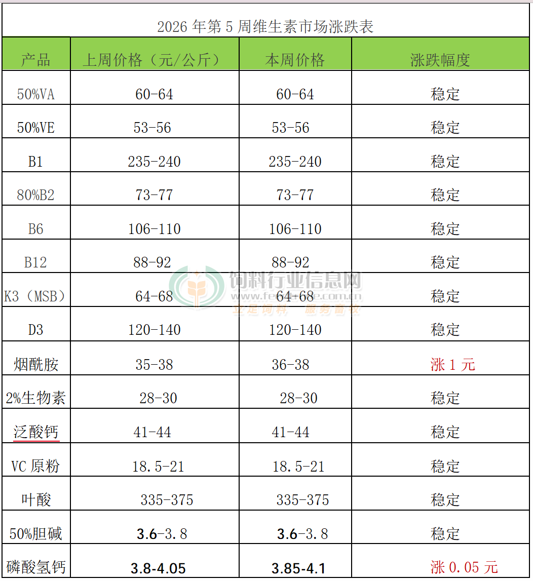 2026年第5周添加剂涨跌榜