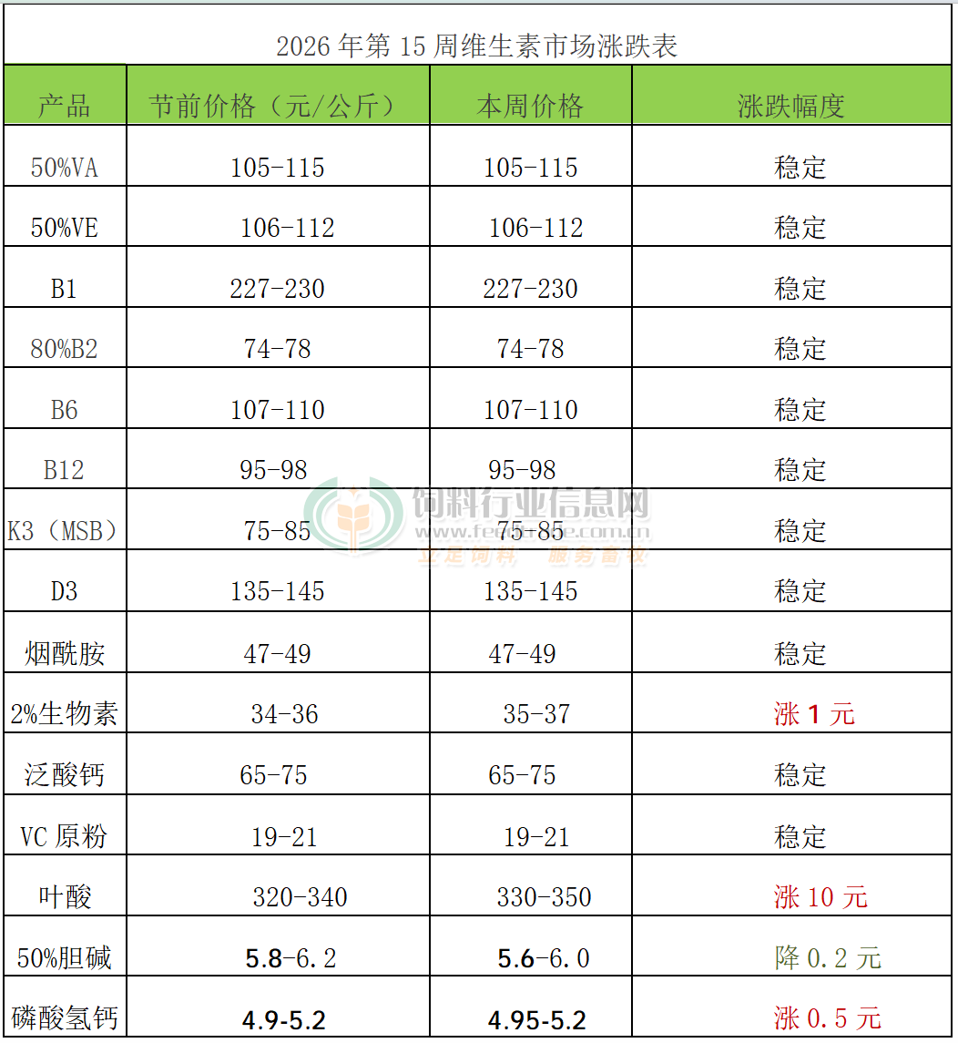 2026年第15周添加剂涨跌榜
