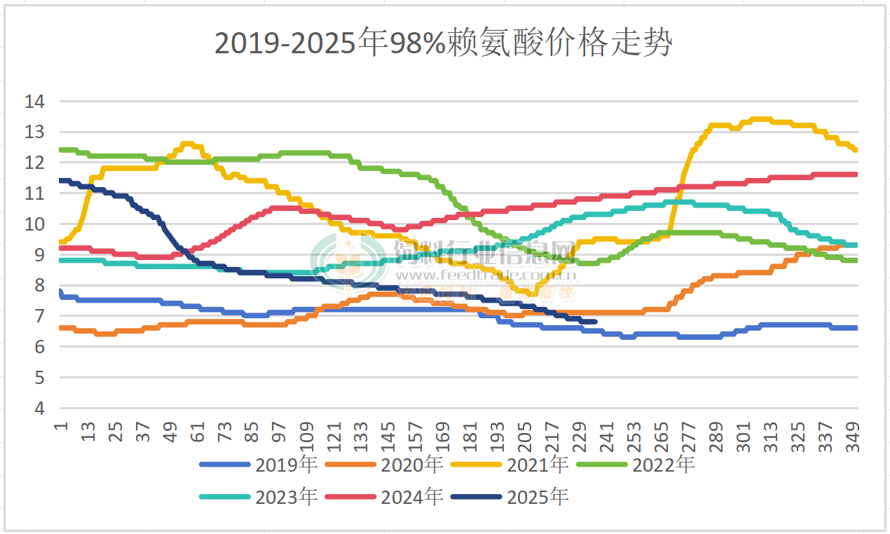 8月赖氨酸市场中,厂家受库存压力影响,连续小幅下调报价,8月底部分厂家98%赖氨酸报价跌至6.6-6.8元/公斤,70%赖氨酸报价跌至4.6-4.8元/公斤。市场随之走弱,不过赖氨酸市场已跌至历史底部,下游采购意愿增加,预计9月赖氨酸市场底部整理,随着购销好转,市场有望触底回暖。后续需注意厂家动态以及出口量价等。