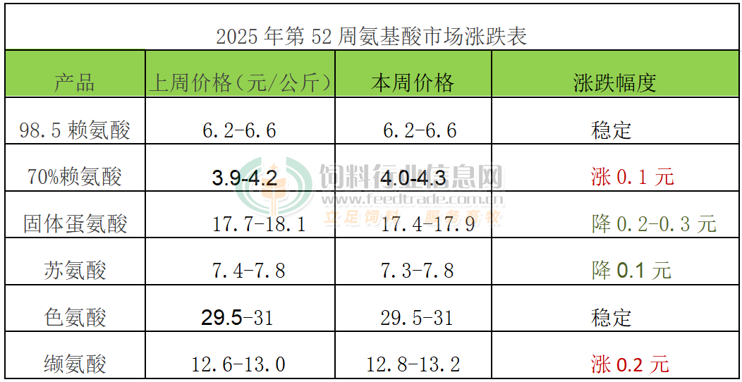 赖氨酸市场中,98%赖氨酸参考报价区间6.2-6.6元/公斤,70%赖氨酸参考报价区间4.0-4.3元/公斤。2025年11月,我国赖氨酸与赖氨酸盐及酯的出口量为9万吨,同比降4%,环比增5.8%。万里润达氨基酸生产线计划近日阶段性升级检修。12月2日市场称市场称成福山东区域70%赖氨酸提价至4.2元/公斤。12月24日伊品生物98.5%赖氨酸报价上调150元/吨,70%赖氨酸报价上调300元/吨 。赖氨酸价格位于历史底部,厂家挺价意愿增加,赖氨酸市场稳中偏强运行。