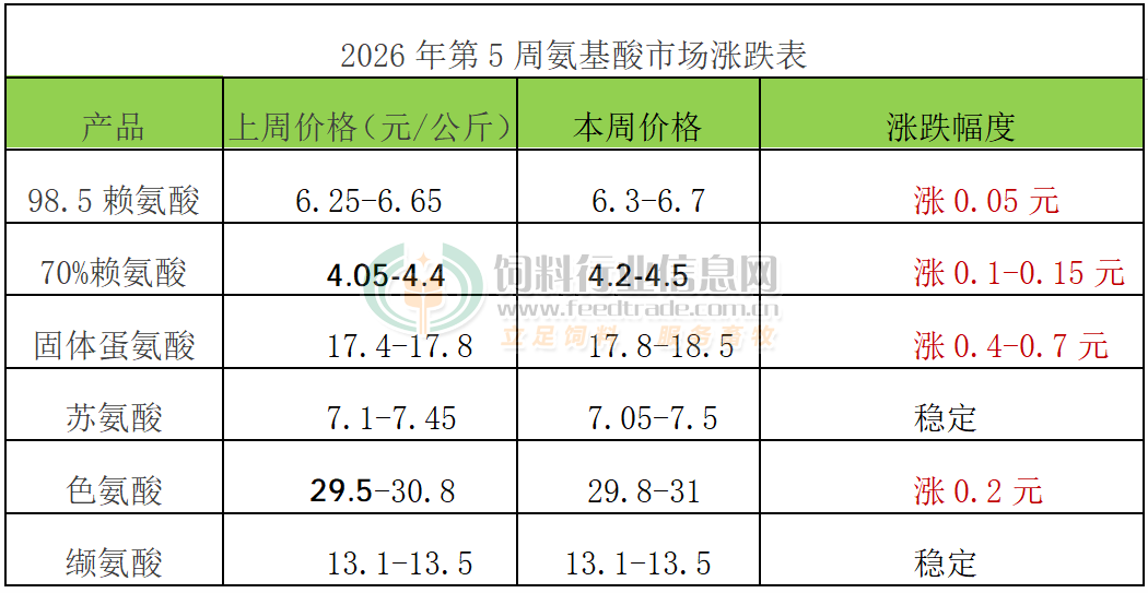 赖氨酸市场中,98%赖氨酸参考报价区间6.3-6.7元/公斤,70%赖氨酸参考报价区间4.2-4.5元/公斤。2025年12月,我国赖氨酸与赖氨酸盐及酯的出口量为9.8万吨,同比增0.4%,环比增8.4%。万里润达氨基酸生产线计划近日阶段性升级检修。出口量回升,且原料玉米价格有所上涨,厂家挺价意愿依存,本周星湖伊品98.5%赖氨酸上调150元/吨,70%赖氨酸上调200元/吨 ,赖氨酸市场成交上涨,稳中偏强运行。