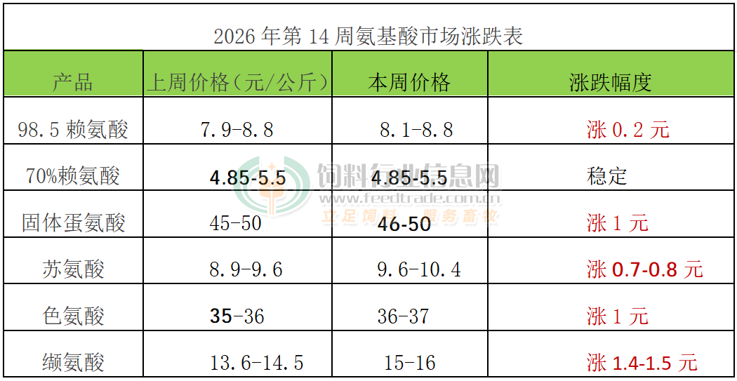 苏氨酸市场动态,依据不同品牌不同货量,市场报价9.6-10.4元/公斤。2026年1-2月国内苏氨酸出口量11.8万吨,同比增8%。梅花新工厂产能预计2026年3季度释放,3月16日星湖伊品大品种氨基酸再度上调300-1000元/吨。4月1日象屿生化苏氨酸报价11000元/吨,上涨200元/吨。厂家挺价,苏氨酸市场供应紧张,偏强运行。