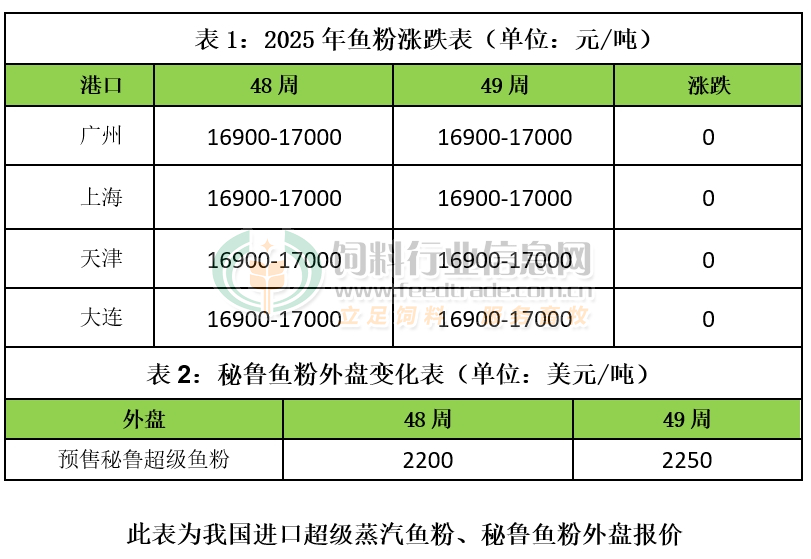 本周外盘鱼粉价格上涨,当前新季秘鲁超级蒸汽鱼粉预售参考价格为CNF2250美元/吨,上涨 50美元/吨。进入11月下旬后,秘鲁中北部捕鱼量下降,主要受到禁捕消息以及秘鲁北部冷水团南下等影响到捕鱼量。对于配额无法完成的担忧,秘鲁鱼粉厂商心态坚挺,但高价也一定程度限制成交。捕鱼方面,11月7日-12月2日中北部共计捕鱼771023吨,完成配额47.3%。