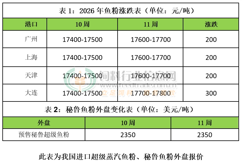 国内进口鱼粉价格再上一台阶,其中秘鲁超级蒸汽鱼粉价格集中在17600-17800元/吨,上涨200-300元,实际成交议价。一方面对弱厄尔尼诺担忧影响到A季捕鱼情况,一方面大宗商品价格集体上涨提振市场情绪。更重要的是目前鱼粉持货商持货集中以及港口鱼粉库存有所下降等均提振鱼粉价格持续性大幅抬升。除此之外,国产鱼粉价格周内也上涨,其中山东荣成地区63%蛋白TVN150国产鱼粉参考报价在14500元/吨,上涨400元/吨。短期鱼粉价格将继续高位趋升为主。
