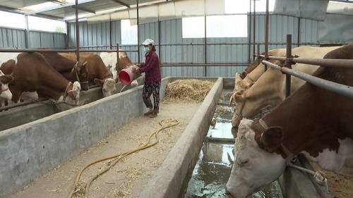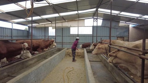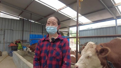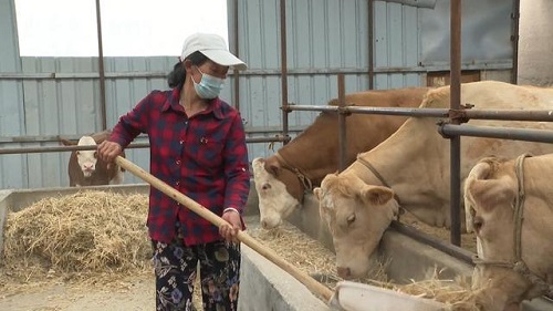 会宁县丁家沟镇金滩村村民 蒋晓霞:我2009年开始养牛,刚开始养了两三头,2015年我贷了5万块钱的精准扶贫贷款,买了一些品种牛,如西门塔尔、夏洛来,慢慢地把牛养多了,养到了七八头。
