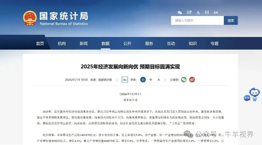 据国家统计局网站1月19日消息,2025年,面对国内外经济环境的复杂变化,在以习近平同志为核心的党中央坚强领导下,各地区各部门深入贯彻落实党中央、国务院决策部署,坚定不移贯彻新发展理念、推动高质量发展,统筹国内国际两个大局,统筹发展和安全,实施更加积极有为的宏观政策,纵深推进全国统一大市场建设,国民经济运行顶压前行、向新向优,高质量发展取得新成效,经济社会发展主要目标任务圆满实现,“十四五”胜利收官。