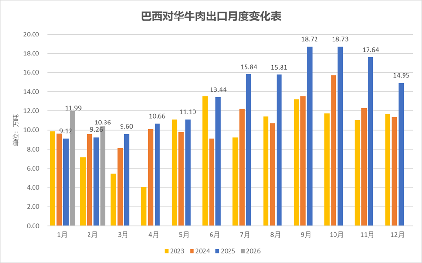 2月,巴西对华出口牛肉10.36万吨,同比增长11.9%,同样刷新2月历史纪录。尽管从同比看表现强劲,但环比来看,这一数字是自2025年3月以来的最低月度值。受中国市场需求季节性回落影响,年初采购节奏放缓属正常波动。