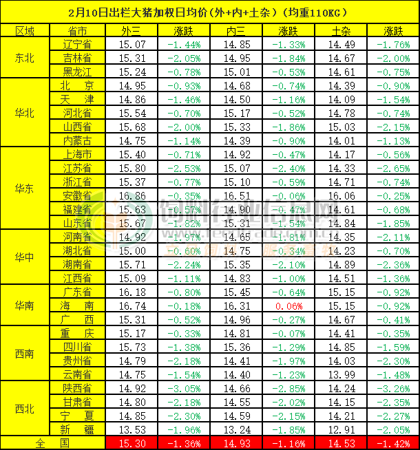 2025年2月10日,中国主流市场出栏外三元、内三元及土杂商品大猪加权日均价下跌,全国生猪出栏加权日均价15.19元每公斤,相比昨天下跌1.32%。