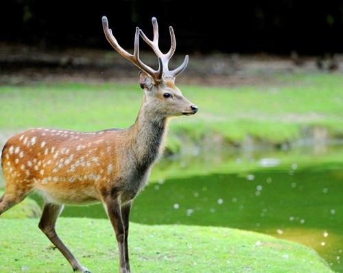 三、适时配种:一般到1.5岁时,鹿就已性成熟,但此时身体尚未成熟,适宜的配种年龄应在2.5岁。鹿的繁殖期是8月下旬至11月。母鹿每隔18-24天发情1次,每次持续2-4天。种公鹿应选择生长快、产茸多、抗病力强、遗传性稳定的健壮公鹿,一般每15-20只母鹿放1只种公鹿。母鹿发情后,应适时放对配种,一般交配2-3次。鹿的妊娠期,梅花鹿为231-236天,马鹿为240-250天。每胎产仔1-2只。