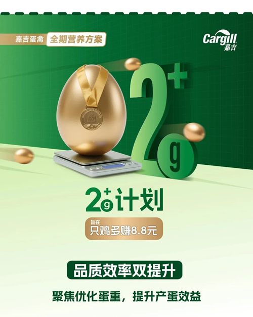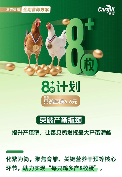 嘉吉蛋鸡增效计划在全国进行得如火如荼,作为嘉吉三大增效解决方案的重要组成部分8枚+计划(攻蛋数)与2g+计划(攻蛋重)、1910俱乐部(低料比)共同构成嘉吉蛋鸡增效计划的完整解决方案,为不同需求的养殖场提供针对性增效路径。