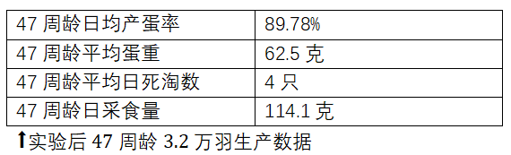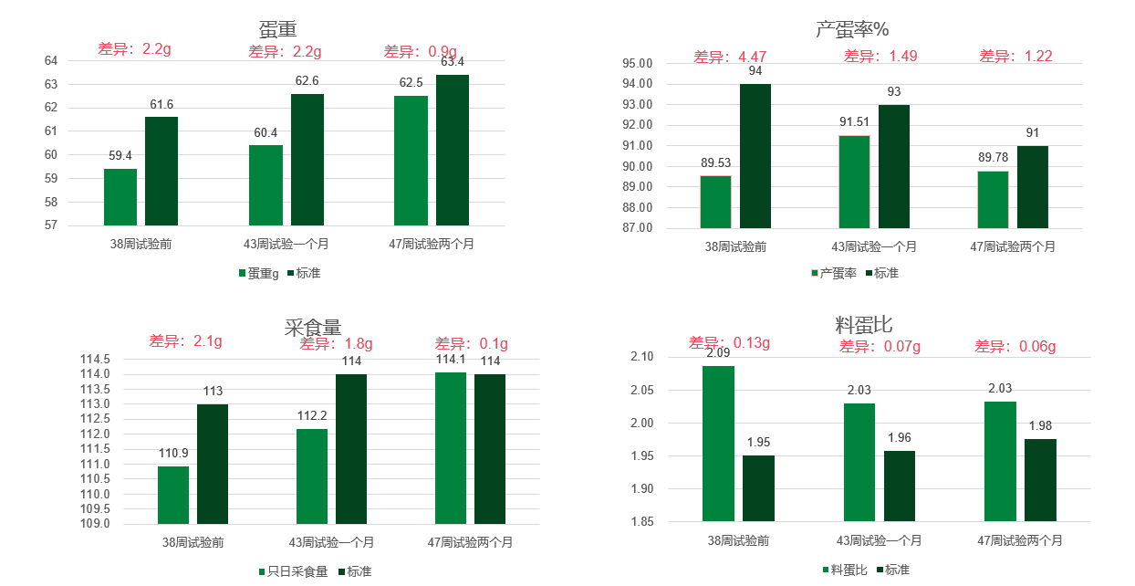 经过两个月的试验,蛋重与产蛋率与标准改善较多,逐步接近标准,采食量已经恢复到标准,料蛋比显著降低,整体经济效益得到提升。