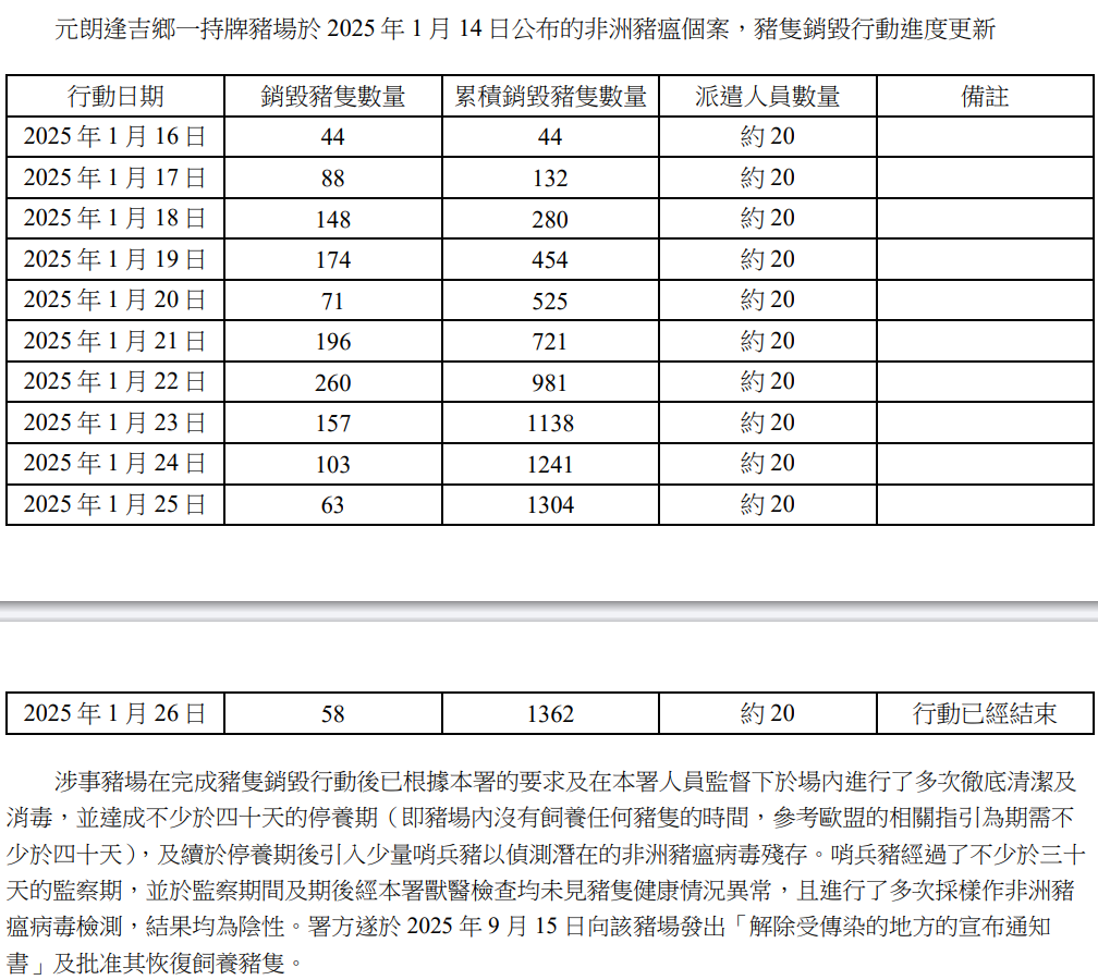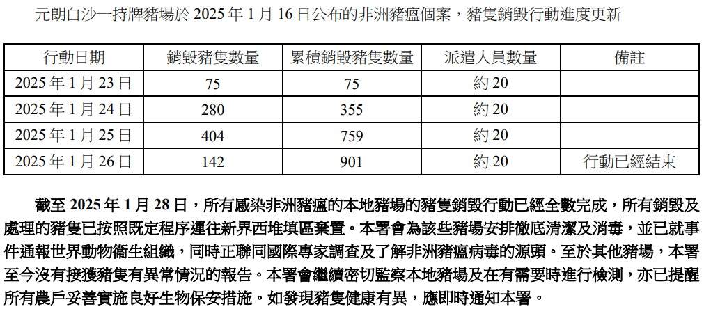 截至目前,涉事猪场已全面禁运,猪只销毁行动正在有序推进,累计销毁猪只978头,所有销毁猪只均按规范运往新界西堆填区无害化处理。