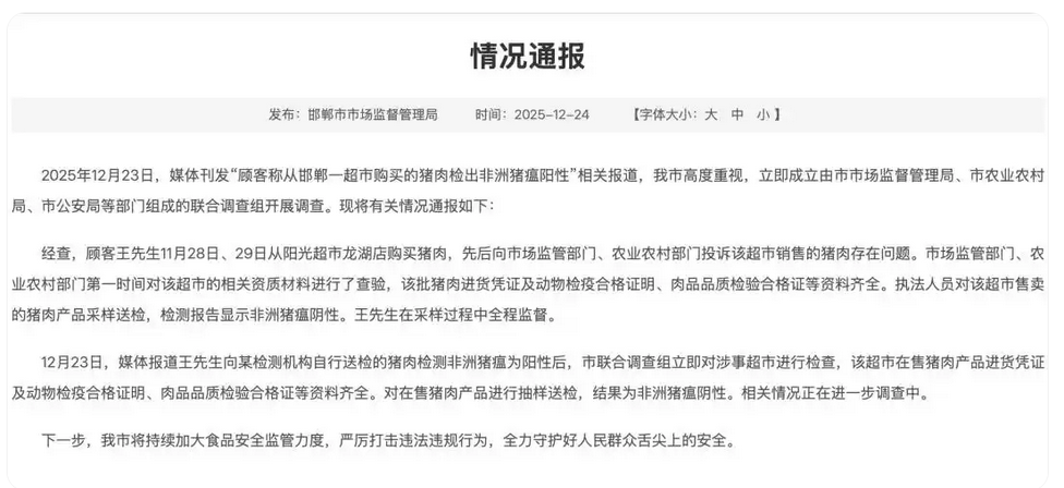 近日,河北邯郸一位消费者在超市购买猪肉后,因食用时感觉口感异常,自行将样本送往具备国家资质的检测机构进行检验,结果显示非洲猪瘟病毒核酸检测为阳性。该情况经媒体报道后,迅速引起各方关注。当地市场监管、农业农村等部门立即组成联合调查组介入,对涉事超市的猪肉产品进行多轮抽样检测。根据官方通报,超市该批次猪肉的进货凭证、动物检疫合格证明及肉品品质检验合格证齐全,执法人员在消费者监督下采样送检,结果均为非洲猪瘟阴性。目前事件仍在进一步调查中。