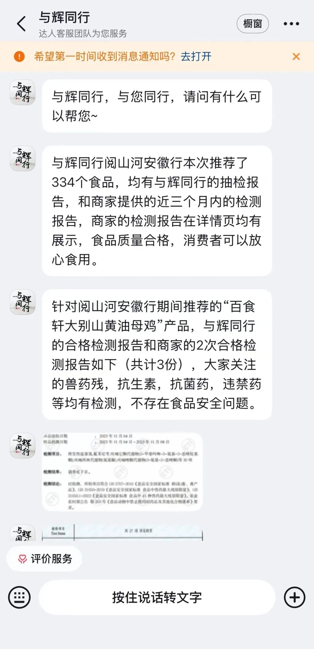 详细文字介绍道:“与辉同行”推荐的产品“百食轩大别山黄油母鸡”,大家关注的兽药残、抗生素、抗菌药、违禁药等均有检测合格,不存在食品安全问题。