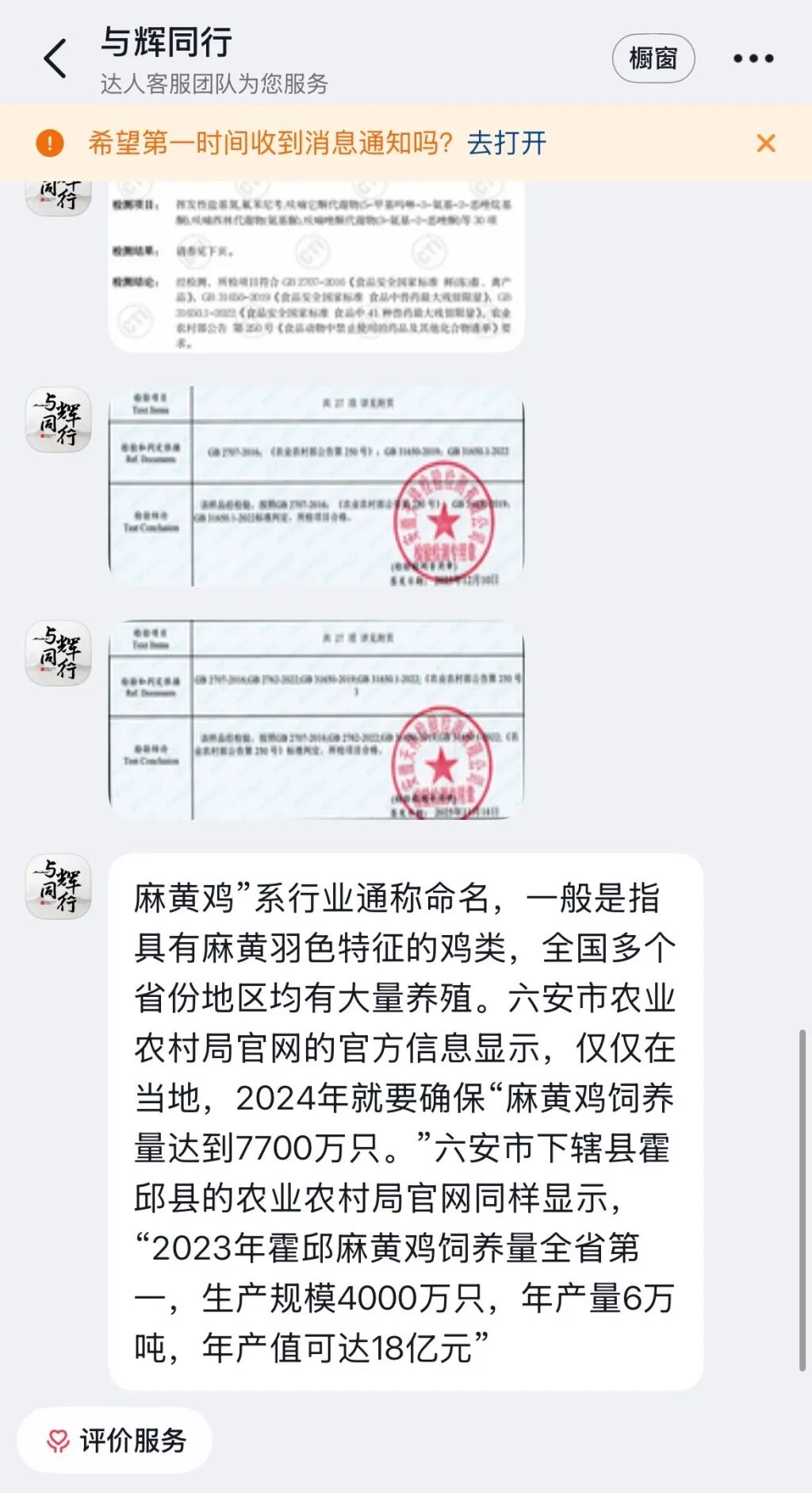 1月15日晚上,澎湃新闻再次以消费者身份向“与辉同行”客服咨询所涉争议的产品一事,客服发来三段文字和三张检测报告的结论部分,主要说明了两点:一是所售产品质量合格;二是“麻黄鸡”是行业俗称。