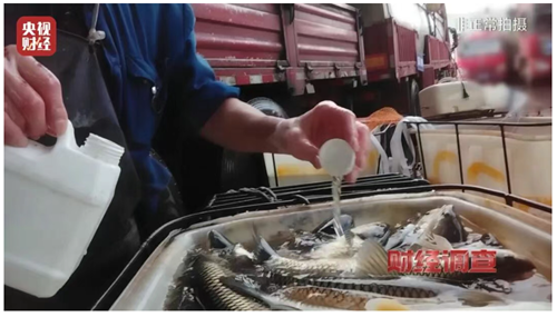 在运输环节上,记者看到工人往装活鱼的桶里加一瓶盖液体搅拌后,活蹦乱跳的鱼瞬间安静瘫软。
