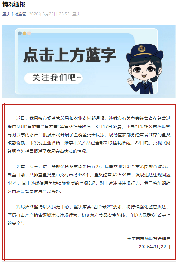 3月22日晚,重庆市市场监督管理局发布情况通报。通报称,近日,该局接市场监管总局和农业农村部通报,涉重庆市有关鱼类经营者在经营过程中使用“鱼护宝”“鱼安宝”等鱼类镇静物质。3月17日凌晨,该局组织辖区市场监管局对涉事的水产品批发市场开展了全覆盖突击执法,现场查获部分经营者储存的鱼类镇静物质,未发现工业酒精,涉事相关产品已全部采取控制措施。