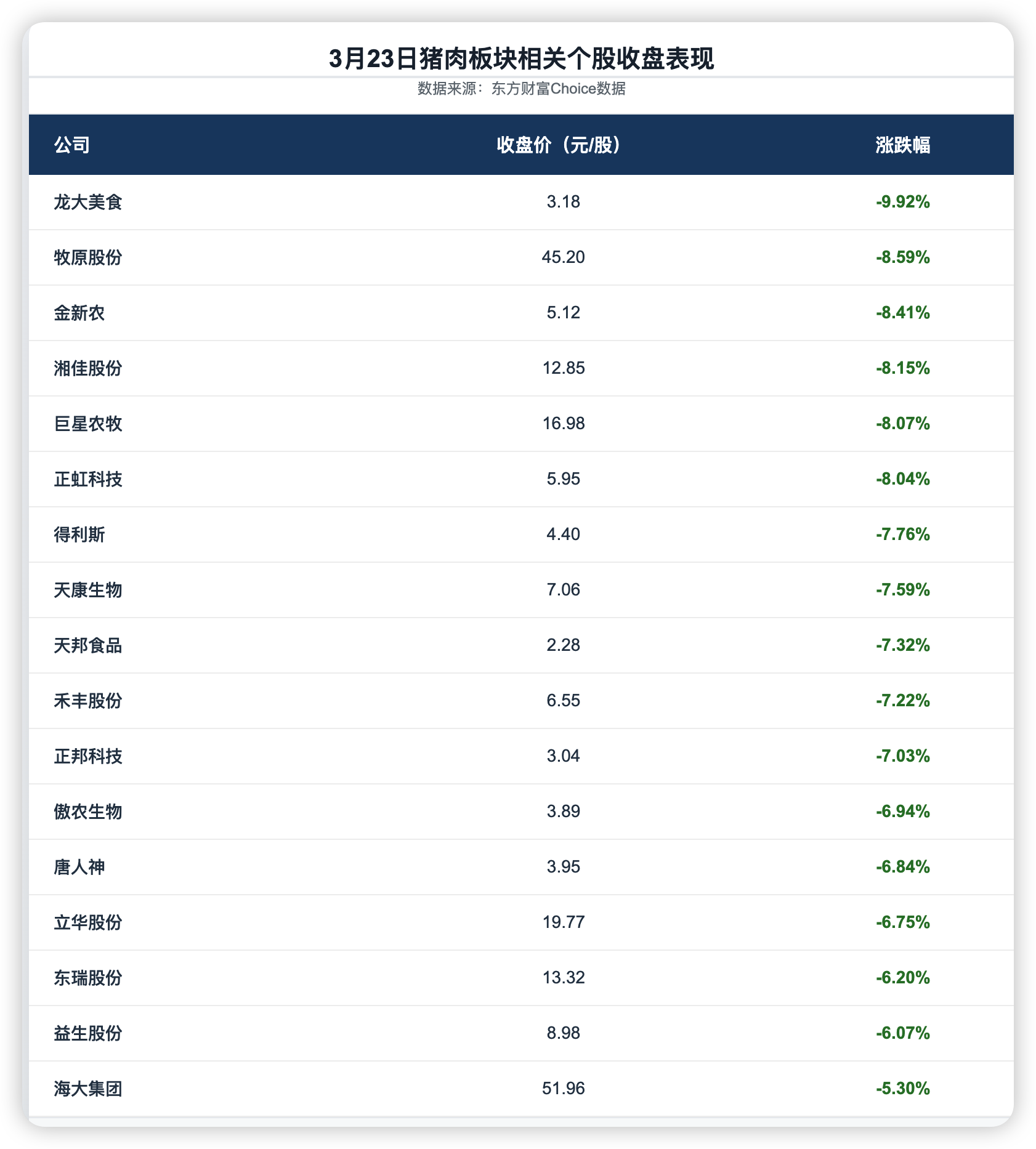 盘面上,龙大美食(002726.SZ)跌幅居首,盘中一度触及跌停,收跌9.92%;牧原股份(002714.SZ)、金新农(002548.SZ)、湘佳股份(002982.SZ)、巨星农牧(603477.SH)、正虹科技(000702.SZ)跌幅均超过8%。此外,得利斯(002330.SZ)、天康生物(002100.SZ)、天邦食品(002124.SZ)、禾丰股份(603609.SH)、正邦科技(002157.SZ)等个股跌幅也均超过7%,板块整体承压明显。相较之下,海大集团(002311.SZ)、益生股份(002458.SZ)、东瑞股份(001201.SZ)跌幅相对靠后,但仍分别下跌5.30%、6.07%和6.20%。整体来看,猪肉板块当日呈现普跌态势,市场情绪较为低迷。