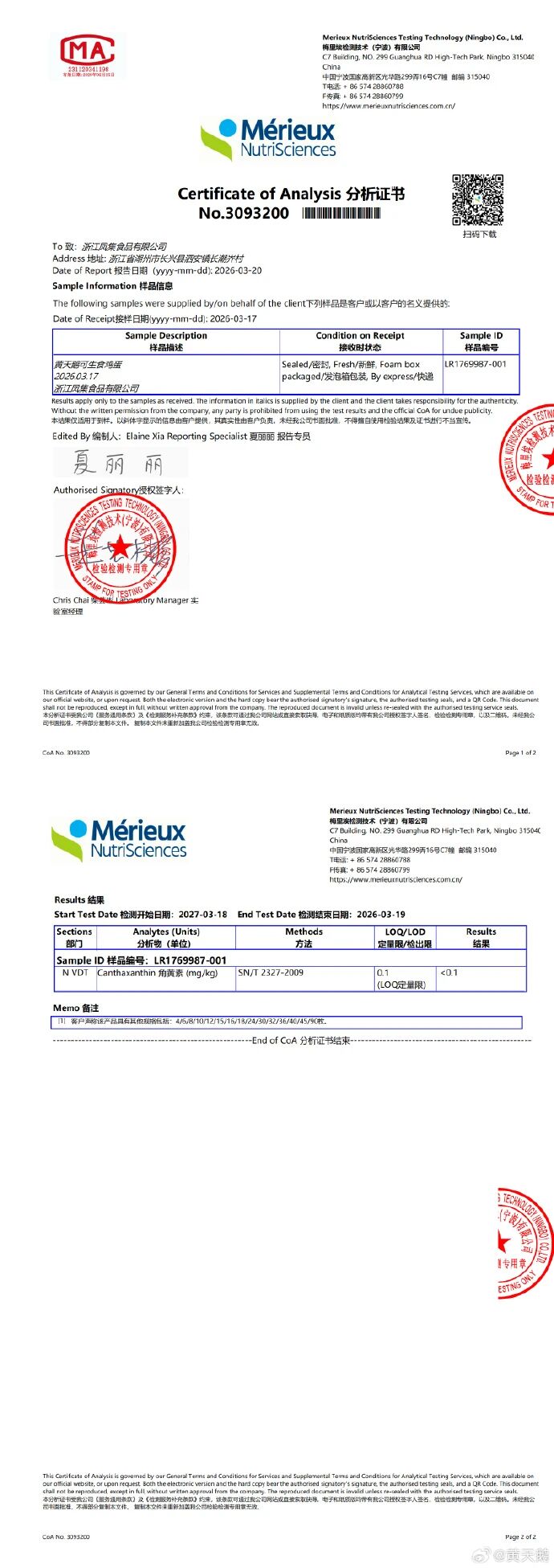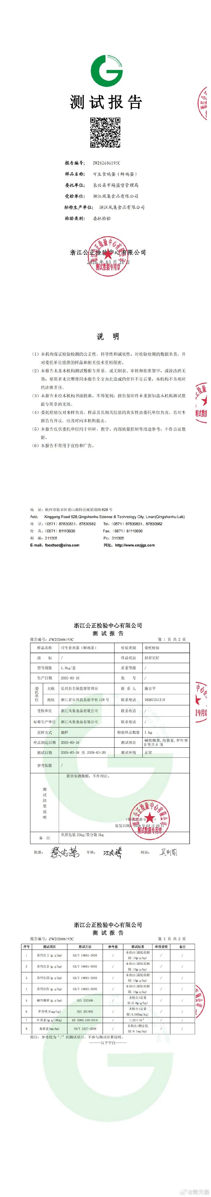 3月25日,黄天鹅在官方微博公布了官方检测结果,包括三地监管部门抽检、企业自检及京东送检在内的多份检测报告,均显示未检出角黄素。