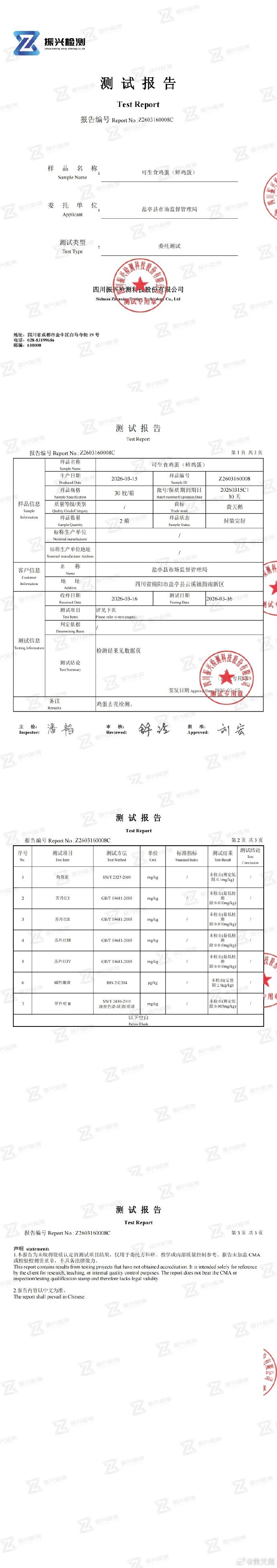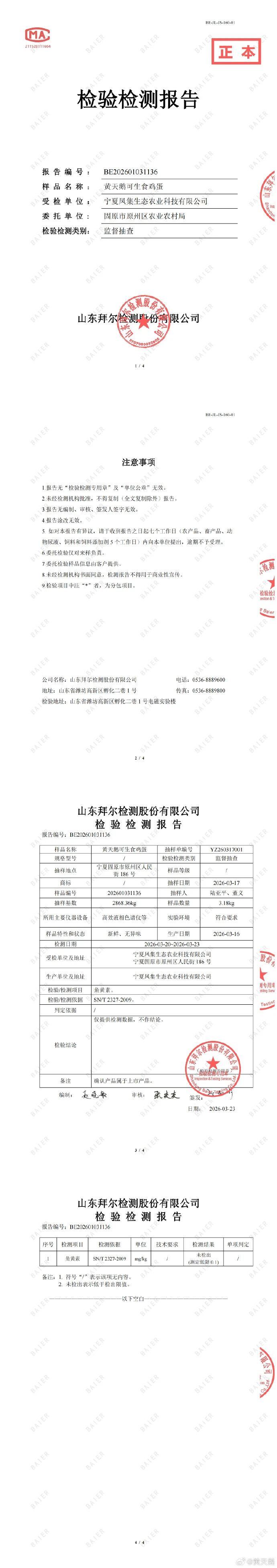 黄天鹅公告显示,三份官方送检报告分别为盐亭县市监局、固原市原州区农业农村局、长兴县市场监督管理局委托三家检测机构出具,显示均未检出角黄素成分。当天公布的黄天鹅自检报告也显示未检出角黄素。