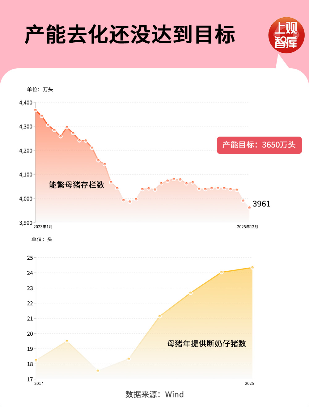 2024年4月能繁母猪存栏量达到低点,之后这个数据一直在低位徘徊,2025年末全国能繁母猪存栏量为3961万头,但农业农村部最新设定的调控目标已下调至3650万头。这意味着,市场认为目前产能仍过剩,市场供给过多,猪肉价格仍将持续下跌。
