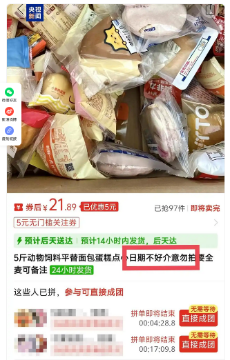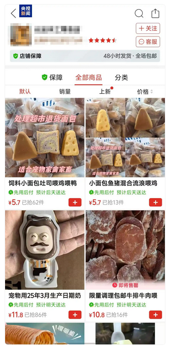 在某电商平台一家店铺内,这里售卖各类动物饲料、“平替”面包、糕点以及超市下架的各品牌进口饼干等等。记者设法联系上了该店铺的负责人,一位名叫“东风”的商家在电话中介绍,他们批发售卖各类过期食品,包括面包、香肠、烧鸡、零食等等,把这些过期食品当作宠物食品卖,仅仅是其中的很小一部分。